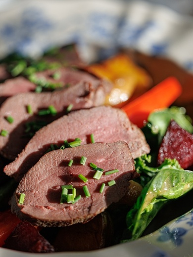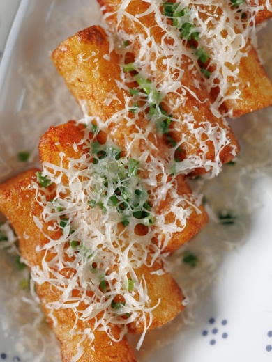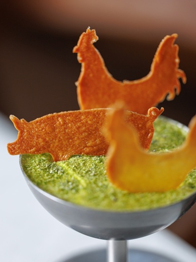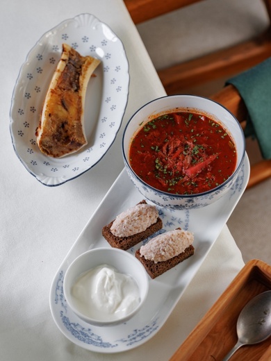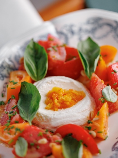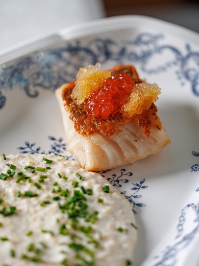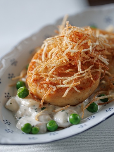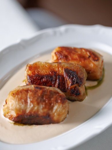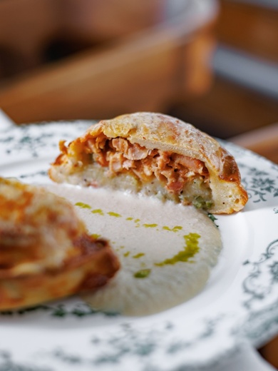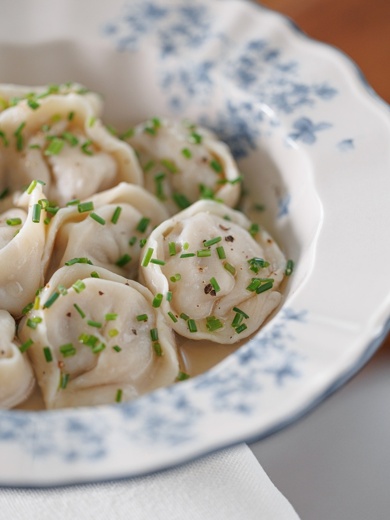 Пельмени с рибаем, перечным соусом и печёными зелёными перцами